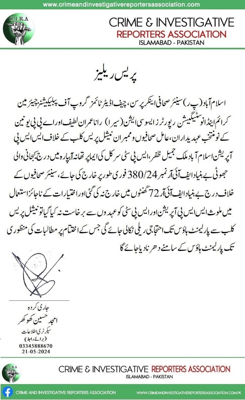 C.I.R.A | Crime & Investigative Reporters Association is working hard to protect the Rights for Journalists of Pakistan. The Chairman Rana Imran Latif, Senior Journalist/Anchorperson have the vision to work globally to protect the journalism and Rights of Journalists of Pakistan.